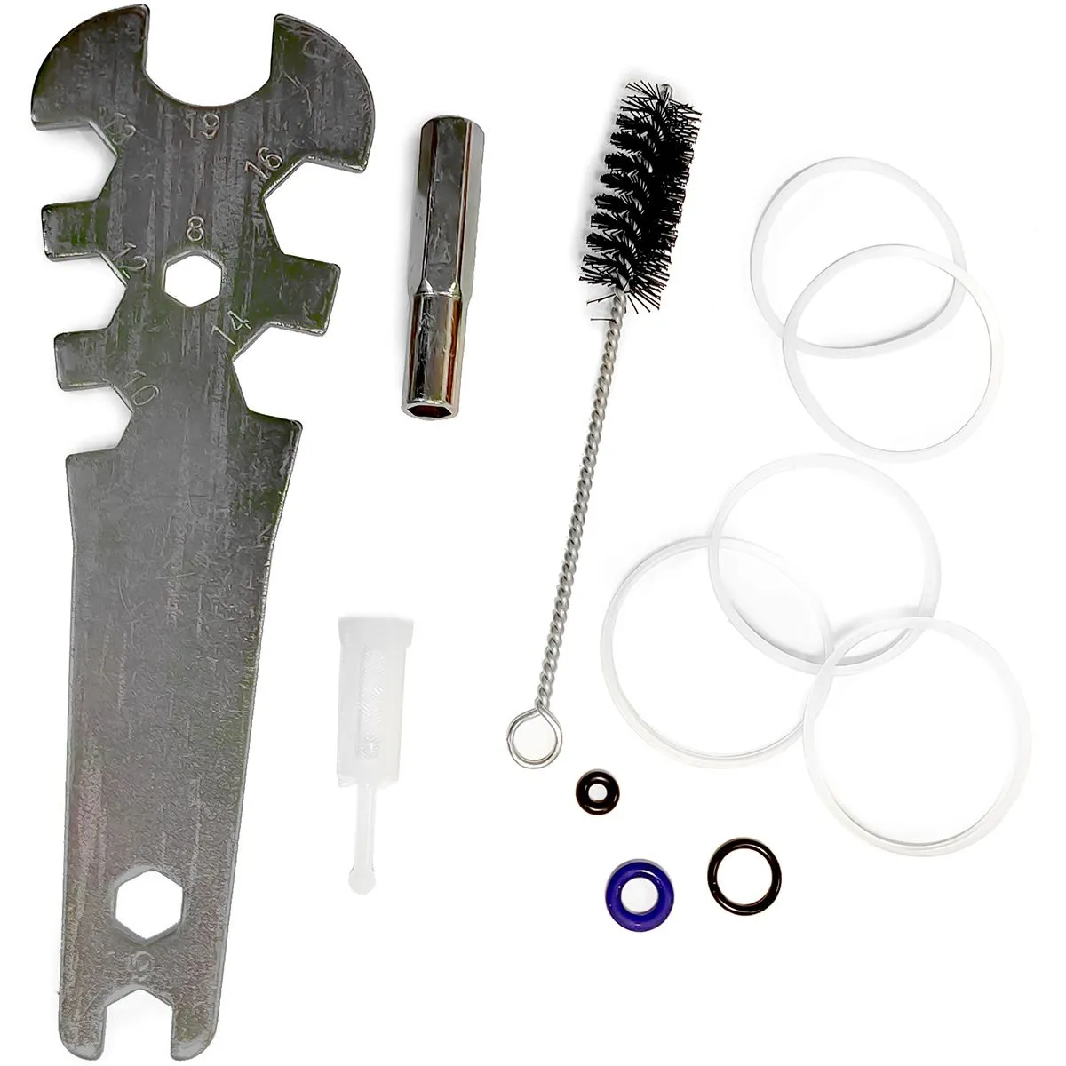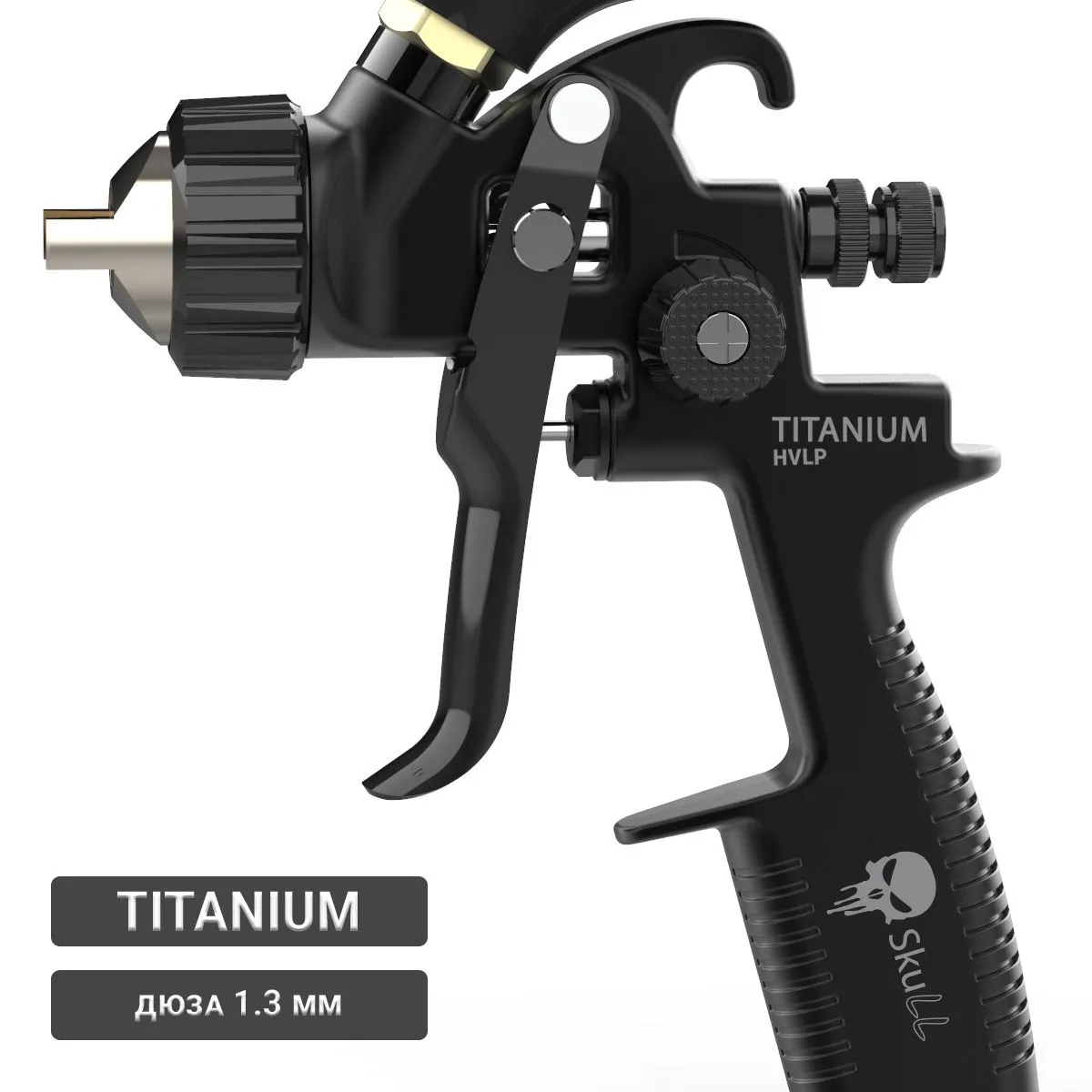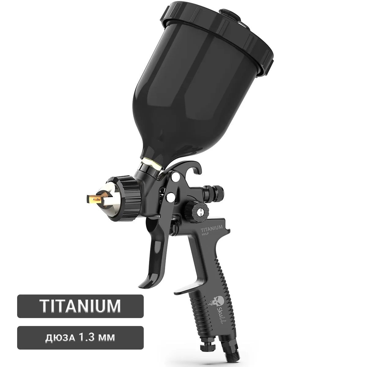 Краскопульт Титаниум Skull с дюзой 1,3мм. Пластиковый бачок 600мл. Запасные прокладки - 8 шт. Ключ ремонтный - 2 шт. Одноразовый фильтр в бачок. Щетка для чистки краскопульта. Инструкция (на русском). Упаковка.
