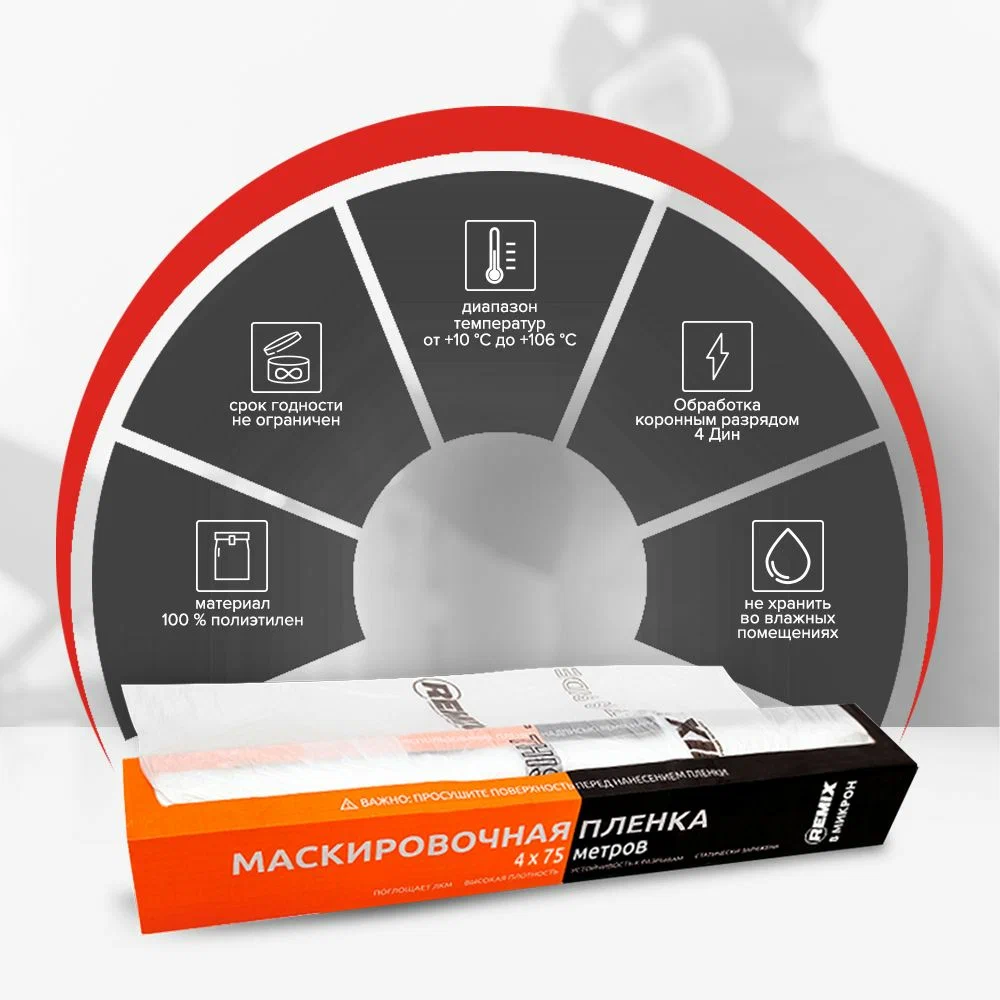 Статичная двухсторонняя маскировочная пленка HDPE. Обработана коронным разрядом. Удерживает ЛКМ на поверхности. Удерживает пыль, плотно прилегает к кузову автомобиля. Устойчива к высоким температурам. Не пропускает воду и растворители. Пленка прозрачная, поставляется в рулоне, в коробке-диспенсере.
