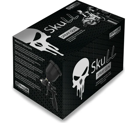SKULL TITANIUM Spray gun краскопульт. Область применения: поверхности с высокими требованиями к качеству покраски, такие как автомобили, мотоциклы, музыкальные инструменты, изделия ручной работы и т. д. Технические характеристики указаны в таблице характеристик на упаковке под пиктограммами. Технология HVLP подходит для техников со стандартной технологией распыления, технология RRP подходит для техников, которые привыкли к высокоэффективному распылению.